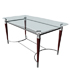 Inspired by Ethan Allen's Coffee Table with Wood and Metal. Traditional wooden coffee table with glass top and scrolled iron detail.