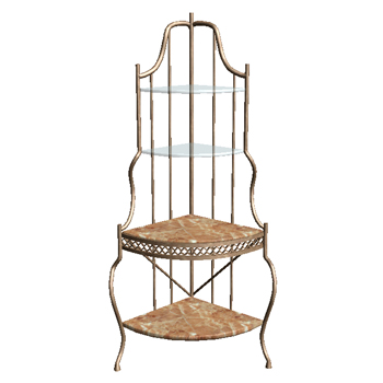 Inspired by Charleston Forge's Bakers Rack. Traditional metal baker's rack with stone and glass shelves.