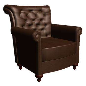 Traditional leather armchar with tufted, scrolled back and ornamental wooden legs.