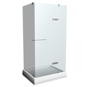 Contemporary corner shower stall with glass walls and doors.