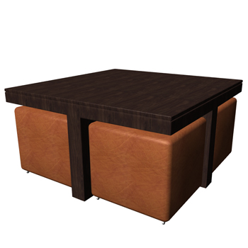 Inspired by Henredon's 6044-40 Cocktail Table. Contemporary wooden coffee table with four leather ottomans on castors.