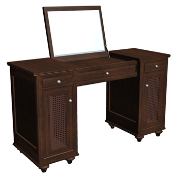 Inspired by Restoration Hardware's British Cane Vanity Dressing Table. Traditional dark wood vanity dressing table with tilt-up beveled mirror.