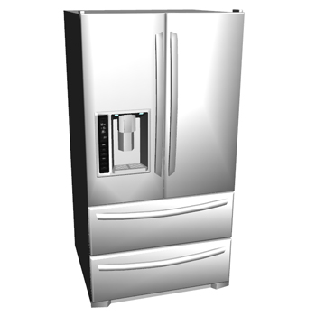 Stainless steel side-by-side refridgerator with two drawer bottom freezer and ice maker.